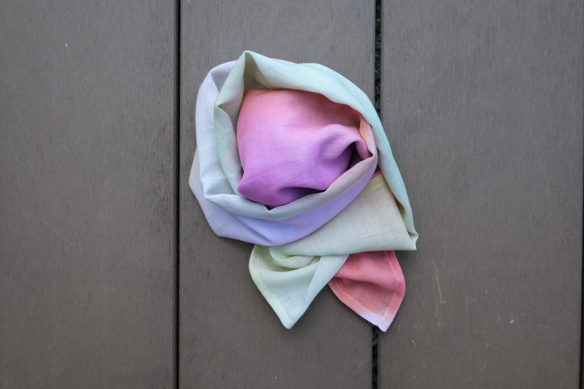 折る位置によって色の出方が変わるのでスカーフ、ストール以外にも帯締めやバックのハンドルに巻いたり、ヘアバンド・ターバンにして楽しむこともできます