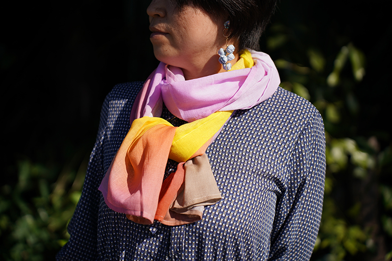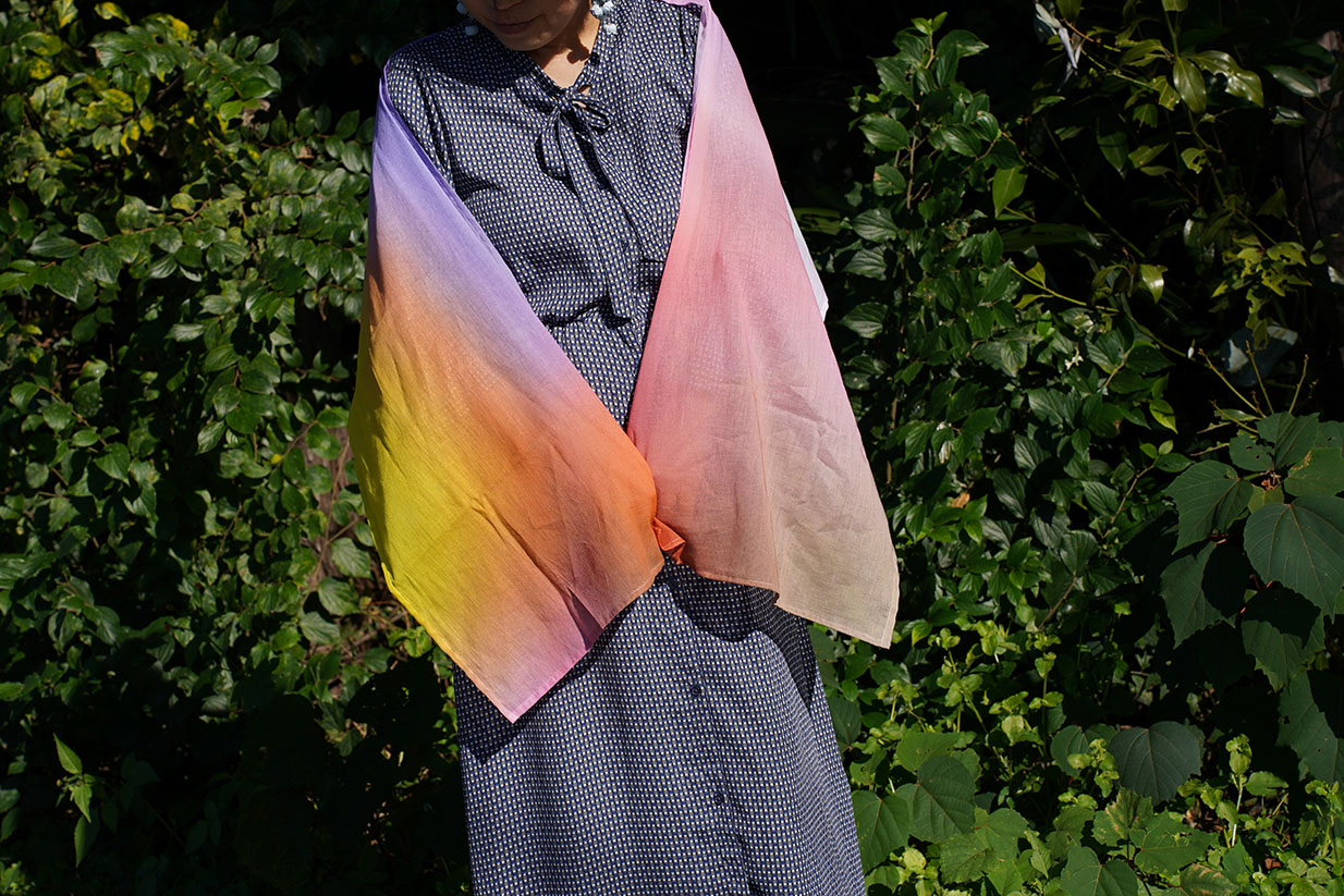 折る位置によって色の出方が変わるのでスカーフ、ストール以外にも帯締めやバックのハンドルに巻いたり、ヘアバンド・ターバンにして楽しむこともできます